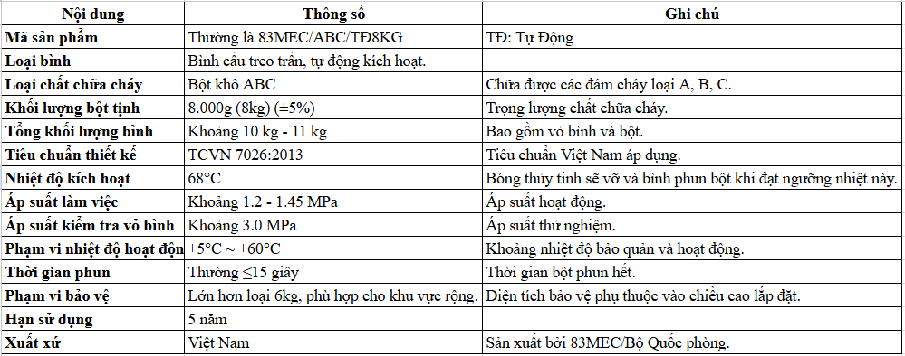 Thông Số Kỹ Thuật Của Bình Cầu Chữa Cháy Tự Động 8Kg 83MEC - BQP