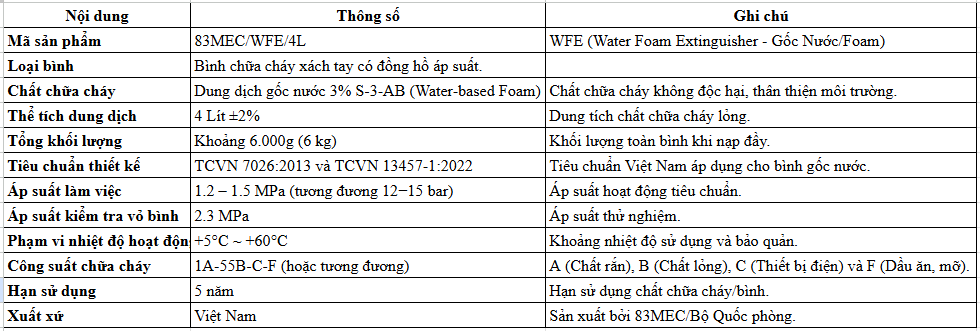 Thông Số Kỹ Thuật Của Bình Chữa Cháy Gốc Nước 4 Lít 83MEC - BQP