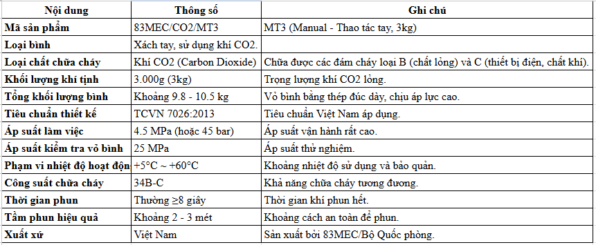 Thông Số Kỹ Thuật Của Bình Chữa Cháy Khí CO2 3Kg 83MEC - BQP