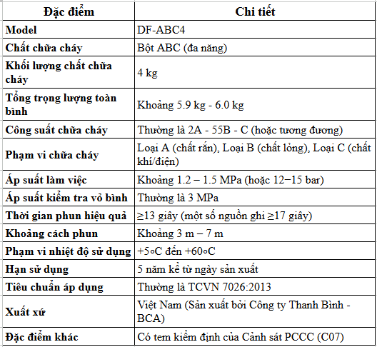 Thông Số Kỹ Thuật Của Bình Chữa Cháy Bột ABC 4Kg Defire DF-ABC4
