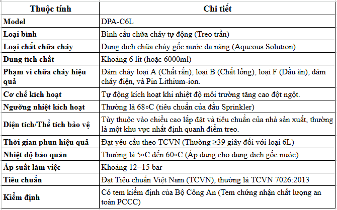 Thông Số Kỹ Thuật Của Bình Cầu Chữa Cháy Đa Năng Gốc Nước Dolphin DPA-C6L Có Kiểm Định