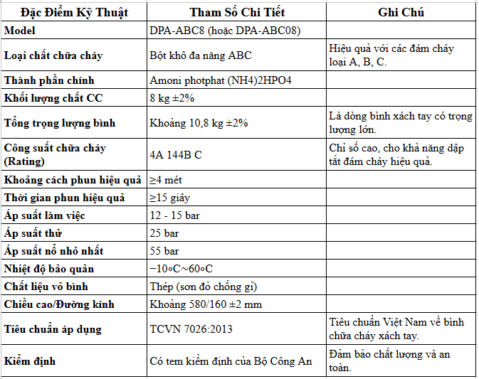 Thông Số Kỹ Thuật Bình Chữa Cháy Bột ABC 8Kg Dolphin DPA-ABC8