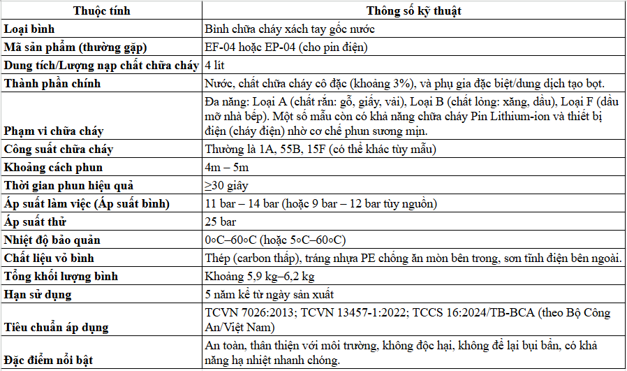 Thông Số Kỹ Thuật Của Bình Chữa Cháy Gốc Nước Elephant 114 4 Lít EF-04