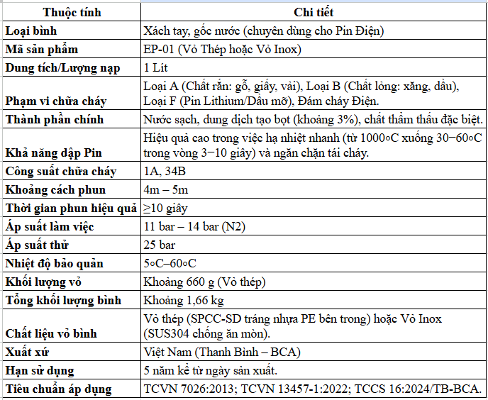 Thông Số Kỹ Thuật Của Bình Chữa Cháy Pin Điện Elephant 114 1 Lít EP-01