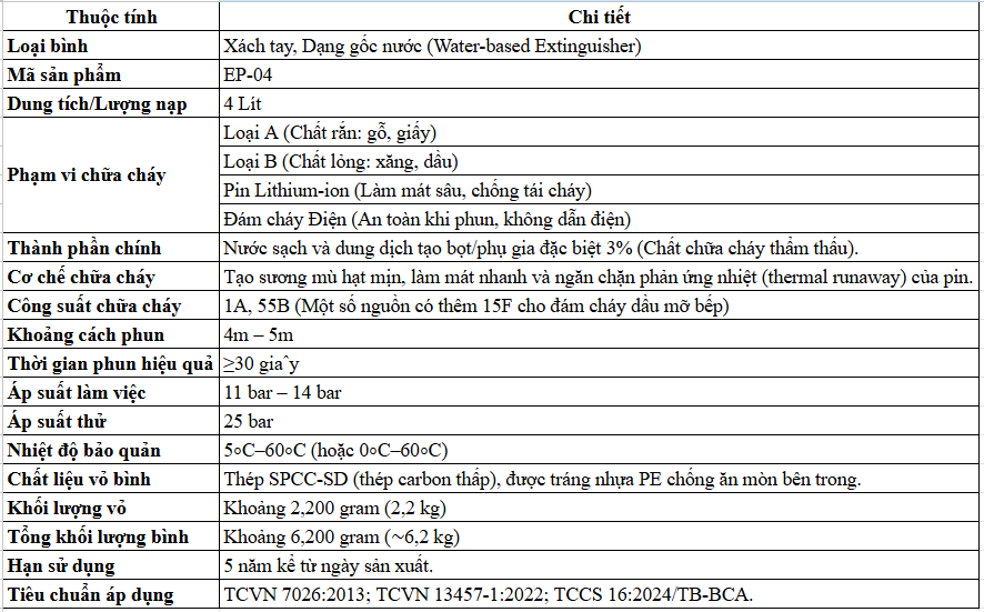Thông Số Kỹ Thuật Của Bình Chữa Cháy Pin Điện Elephant 114 4 Lít EP-04