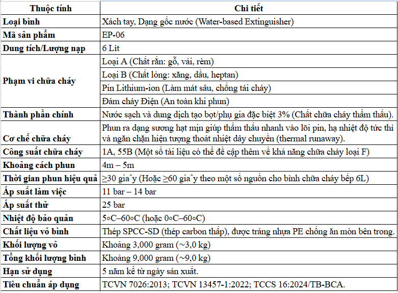 Thông Số Kỹ Thuật Của Bình Chữa Cháy Pin Điện Elephant 114 6 Lít EP-06