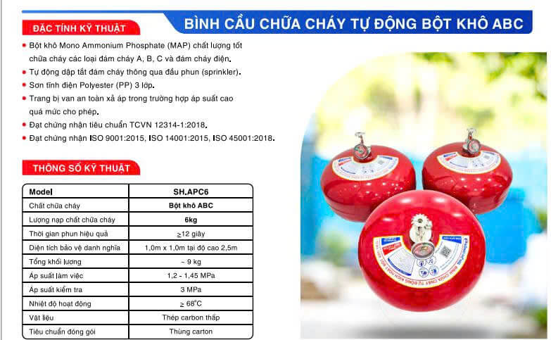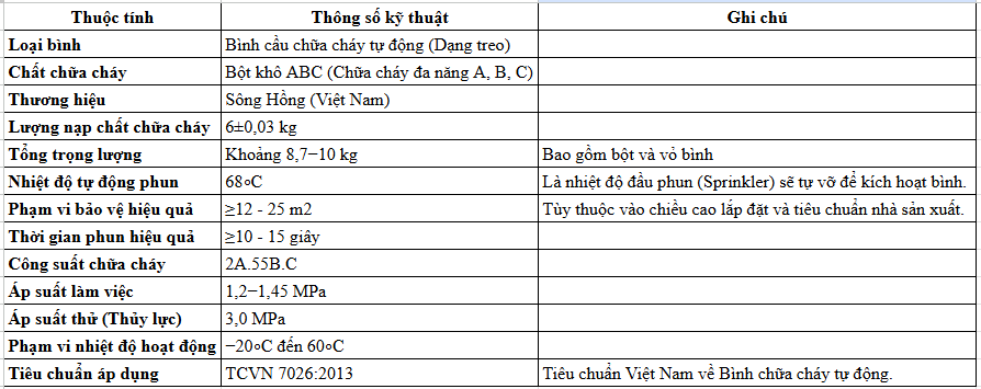 Thông Số Kỹ Thuật Của Bình Cầu Chữa Cháy Tự Động Bột ABC 6Kg Sông Hồng