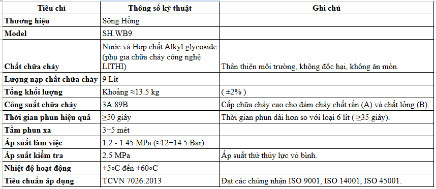 Thông Số Kỹ Thuật Của Bình Chữa Cháy Đa Năng Gốc Nước 9,9 Lít Sông Hồng