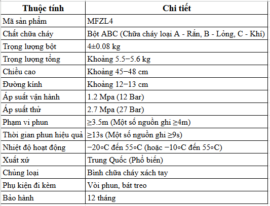 Thông Số Kỹ Thuật Của Bình Chữa Cháy Bột ABC 4Kg MFZL4 Victory