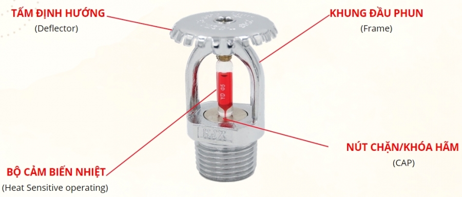 Cảm ứng nhiệt: Là thành phần kiểm soát nhiệt độ để phun nước. Ở nhiệt độ bình thường, bộ cảm ứng sẽ giữ nút chặn lại làm kín nước, khi nhiệt độ cao đạt đến ngưỡng hoạt động, bộ cảm ứng sẽ giải phóng làm rơi nút chặn & phun nước ra ngoài.