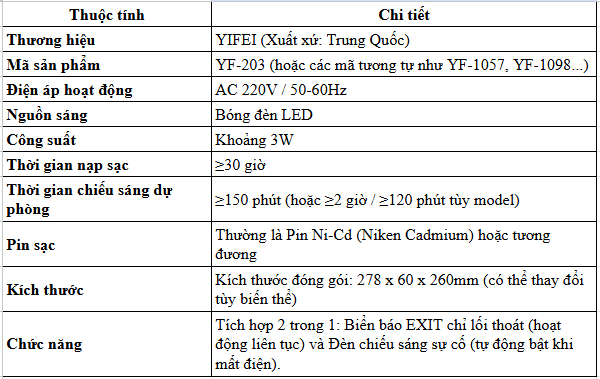 Thông Số Kỹ Thuật Của Đèn Chiếu Sáng Sự Cố Kết Hợp Đèn Exit YIFEI