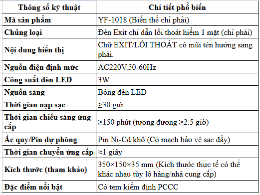 Thông Số Kỹ Thuật Của Đèn Exit Thoát Hiểm 1 Mặt Chỉ Phải YIFEI Có Tem Kiểm Định