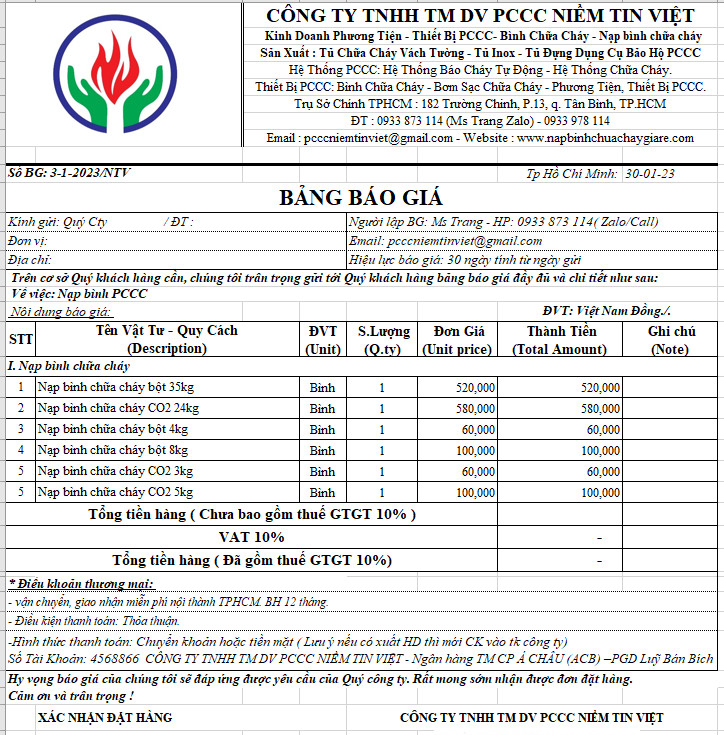 Tham khảo Bảng Báo giá nạp sạc bình chữa cháy mới nhất tại PCCC Niềm Tin Việt