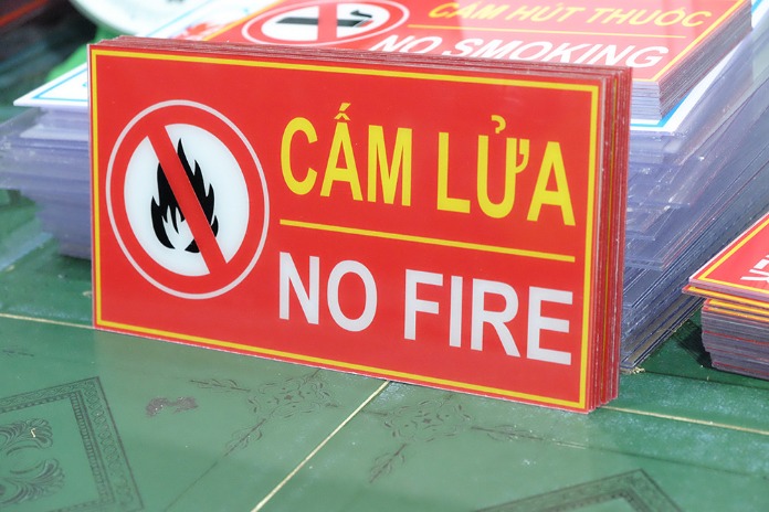 Bảng cấm lửa thường có hình ngọn lựa gạch chéo với nội dung cấm sử dụng lửa kèm tiếng anh No fire