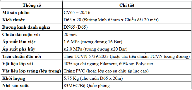 Thông Số Kỹ Thuật Của Cuộn Vòi Chữa Cháy DN65 BQP