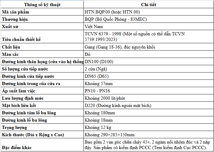 Thông Số Kỹ Thuật Của Họng Tiếp Nước Chữa Cháy 2 Cửa BQP
