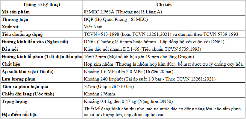 Thông Số Kỹ Thuật Của Lăng Phun Chữa Cháy DN65 BQP
