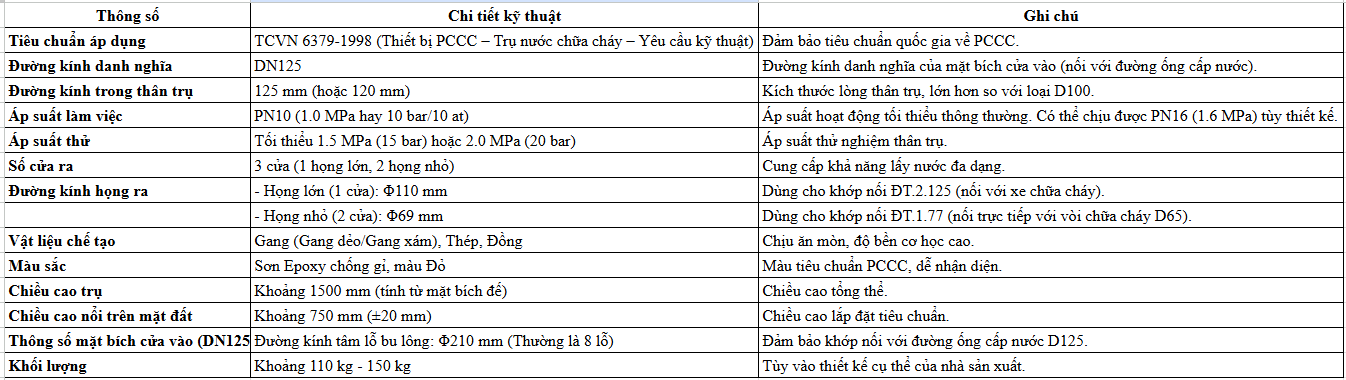 - Lưu lượng nước lớn: Với kích thước D125 mm, trụ có khả năng cung cấp lưu lượng nước lớn, đáp ứng nhanh chóng nhu cầu chữa cháy trong các tình huống khẩn cấp.