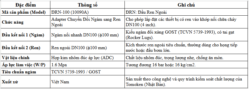 Thông Số Chi Tiết Của Đầu Nối Ren Ngoài ĐRN-100 Tomoken 10090A