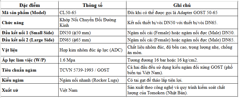 Thông Số Chi Tiết Của Khớp Nối Chuyển Đổi Vòi Tomoken CL50-65