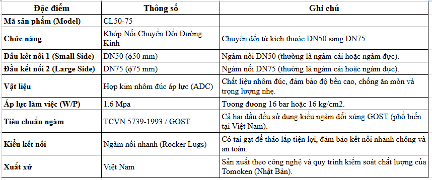 Thông Số Chi Tiết Của Khớp Nối Chuyển Đổi Vòi Tomoken CL50-75