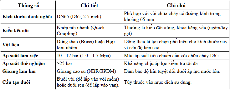 - Kích thước: Với đường kính DN65, khớp nối có khả năng chịu được lưu lượng nước lớn, phù hợp cho các ứng dụng chữa cháy và công nghiệp.
