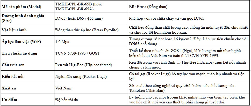 Thông Số Chi Tiết Của Khớp Nối Vòi Đồng DN65 Tomoken TMK-CPL-BR-65B