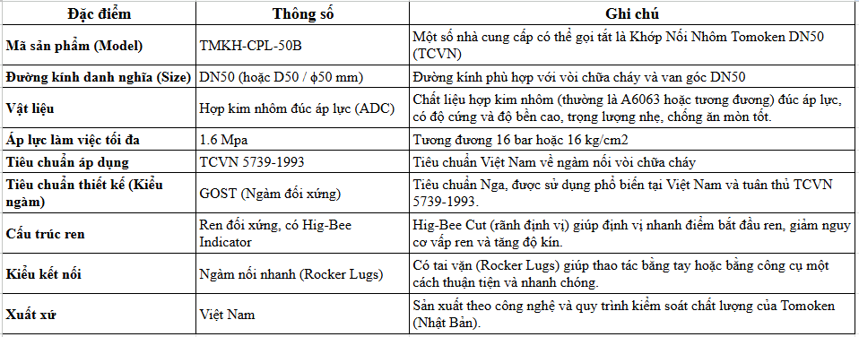 Thông Số Kỹ Thuật Của Khớp Nối Vòi Nhôm Tomoken DN50 (TCVN)