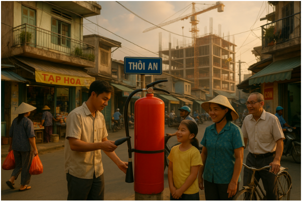 - Mật độ dân cư cao: Thới An không chỉ là nơi sinh sống của hơn 72.000 người (số liệu 2023) mà còn giáp các phường Đông Hưng Thuận, Tân Thới Hiệp, Hiệp Thành, nơi các con hẻm chằng chịt khiến xe chữa cháy khó tiếp cận. Bình chữa cháy tại chỗ là “cứu tinh” trong 3–5 phút đầu – khoảng thời gian vàng để khống chế ngọn lửa.