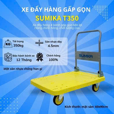 SUMIKA, thương hiệu Nhật Bản được gia công tại Trung Quốc, đã gây dựng uy tín lâu năm nhờ triết lý “bền bỉ – tinh gọn – tiện dụng”. Dòng xe đẩy SUMIKA T350 thừa hưởng trọn vẹn tinh thần đó. Sở hữu thiết kế sàn nhựa PP kích thước 900 x 600 mm, trọng lượng xe chỉ 14,5 kg nhưng sức tải tới 350 kg, T350 chứng minh: giá thành hợp lý vẫn có thể đi đôi với hiệu suất đáng kinh ngạc.