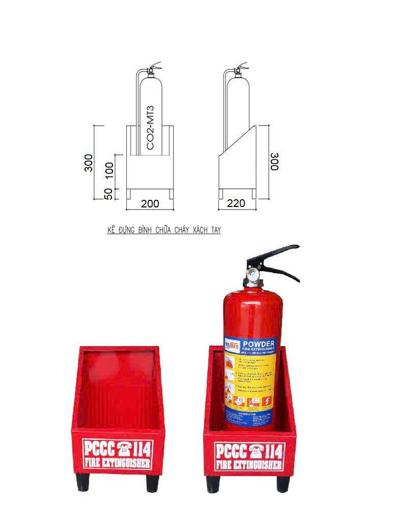 - Kích cỡ tương thích bình: Bình bột MFZ4 cao 45 cm, đường kính 13 cm cần khung đáy Ø15 cm và vòng ôm đặt vị trí 30 cm; bình CO₂ MT5 cao 60 cm cần khung cao hơn. Hãy đo trước hoặc hỏi rõ nhà cung cấp.