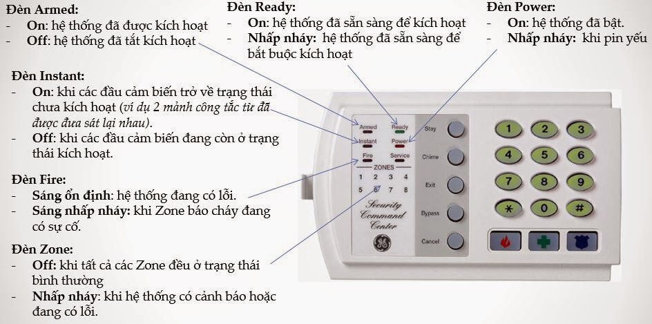 – Đèn ARMED sáng: trung tâm đang vào chế độ giám sát chống đột nhập.