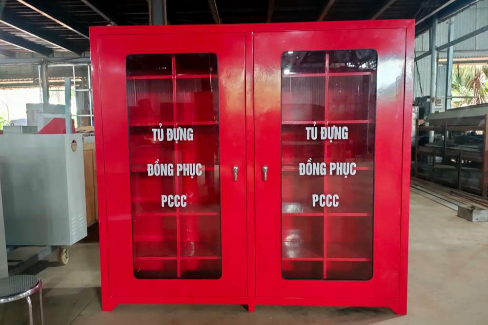 Tủ đựng quần áo chữa cháy-tủ dụng cụ PCCC, để chứa các thiết bị phòng cháy chữa cháy một cách ngăn nắp và có khoa học, tủ được thiết kế là một khối vuông vắn, chắc chắn. Được làm từ chất liệu thép, bên ngoài được phủ lớp sơn tĩnh điện màu đỏ đặc trưng của ngành PCCC, cánh cửa có kính có thể nhìn xuyên để mọi người biết bên trong đựng vật dụng gì.