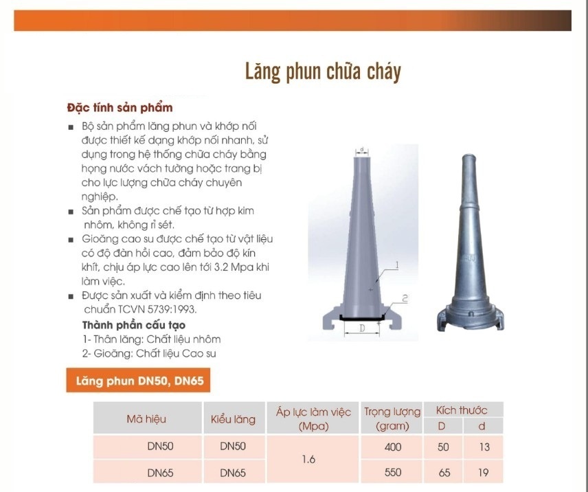 Lăng phun chữa cháy D50 và D56 với xuất xứ từ Việt Nam, sản phẩm được làm từ hợp kim nhôm, bề mặt đã được xử lý oxi hóa, đánh bóng.