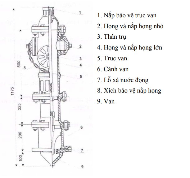 - Theo tiêu chuẩn, phần trụ này được cấu tạo từ 6 bộ phận: nắp đậy bảo vệ, bạc ren, thân trụ, cánh van, lỗ xả nước đọng, van,… Mỗi bộ phận thực hiện một chức năng khác nhau để đảm bảo hoạt động hiệu quả. Phần nắp đậy bảo vệ sẽ được lắp đặt theo 3 nhánh thân ống thực hiện chức năng bảo vệ thân trụ khi không sử dụng và tháo lắp linh hoạt khi cần kết nối với đường ống dẫn nước