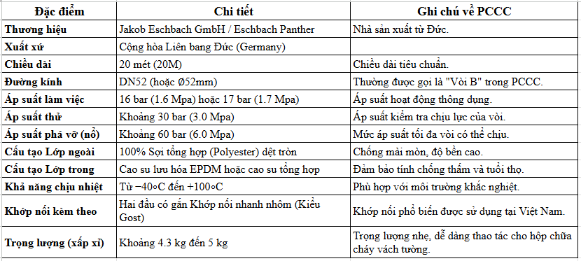 Thông Số Chi Tiết Của Cuộn Vòi Chữa Cháy Jakob Eschbach D52 x 20M Có Kiểm Định