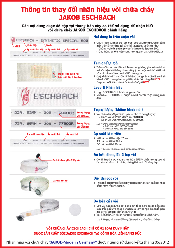 Được thành lập vào năm 1956, công ty Jakob-eschbach hiểu rõ nhu cầu của khách hàng về chất lượng sản phẩm. Nó phải chịu được áp lực cao, có khả năng chống mài mòn, thực hiện ở vùng khí hậu lạnh và nóng vẫn rất linh hoạt và dễ dàng để xử lý. Hơn nữa tất cả các ống của jakob có khả năng chịu nước muối và đáp ứng tất cả các yêu cầu của thị trường hàng hải. lớp ngoài vòi chữa cháy có lớp huỳnh quang cho tầm nhìn tốt hơn trong bóng tối. Tất cả các ống của chúng tôi được hoàn toàn sản xuất tại Đức.